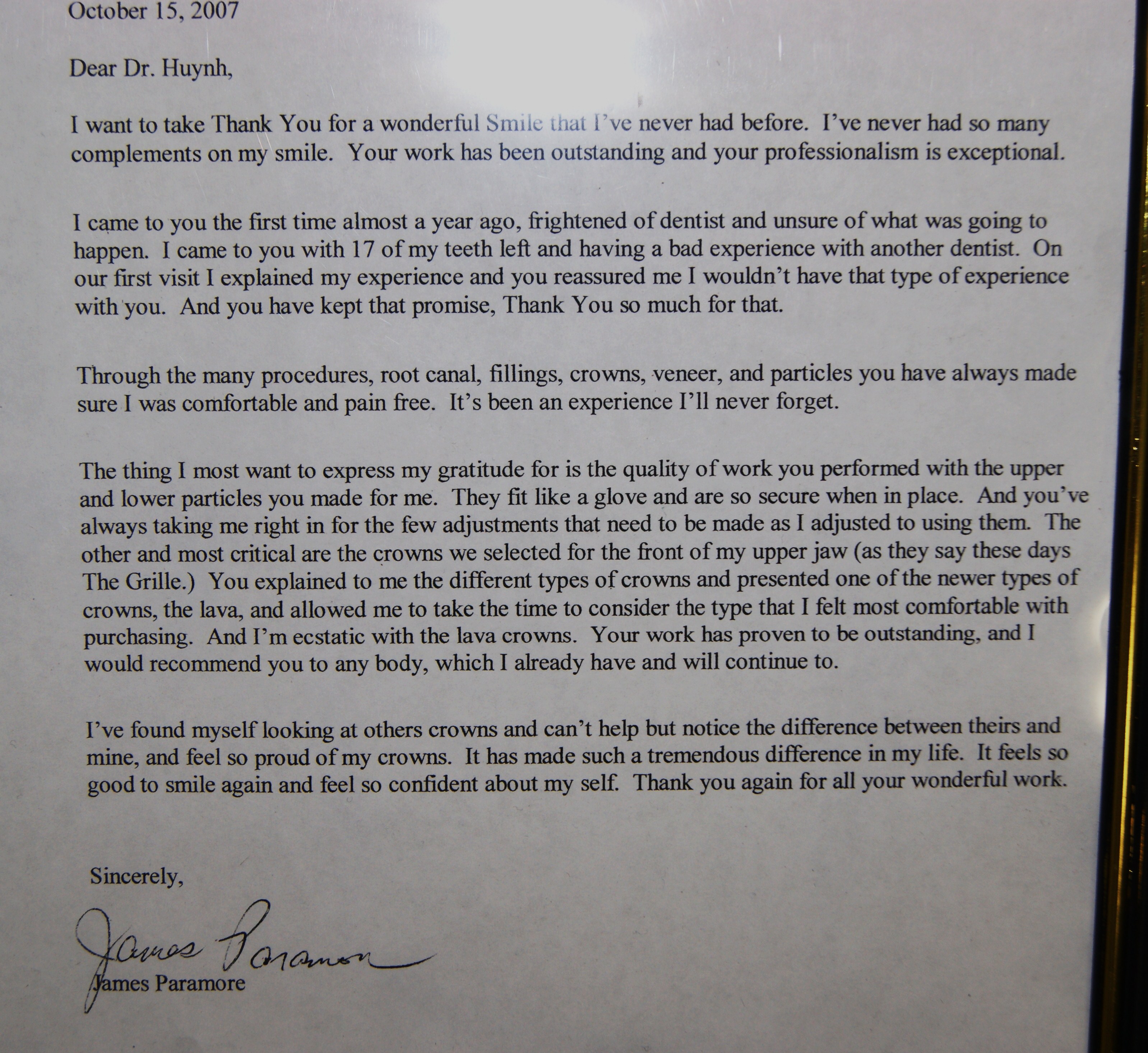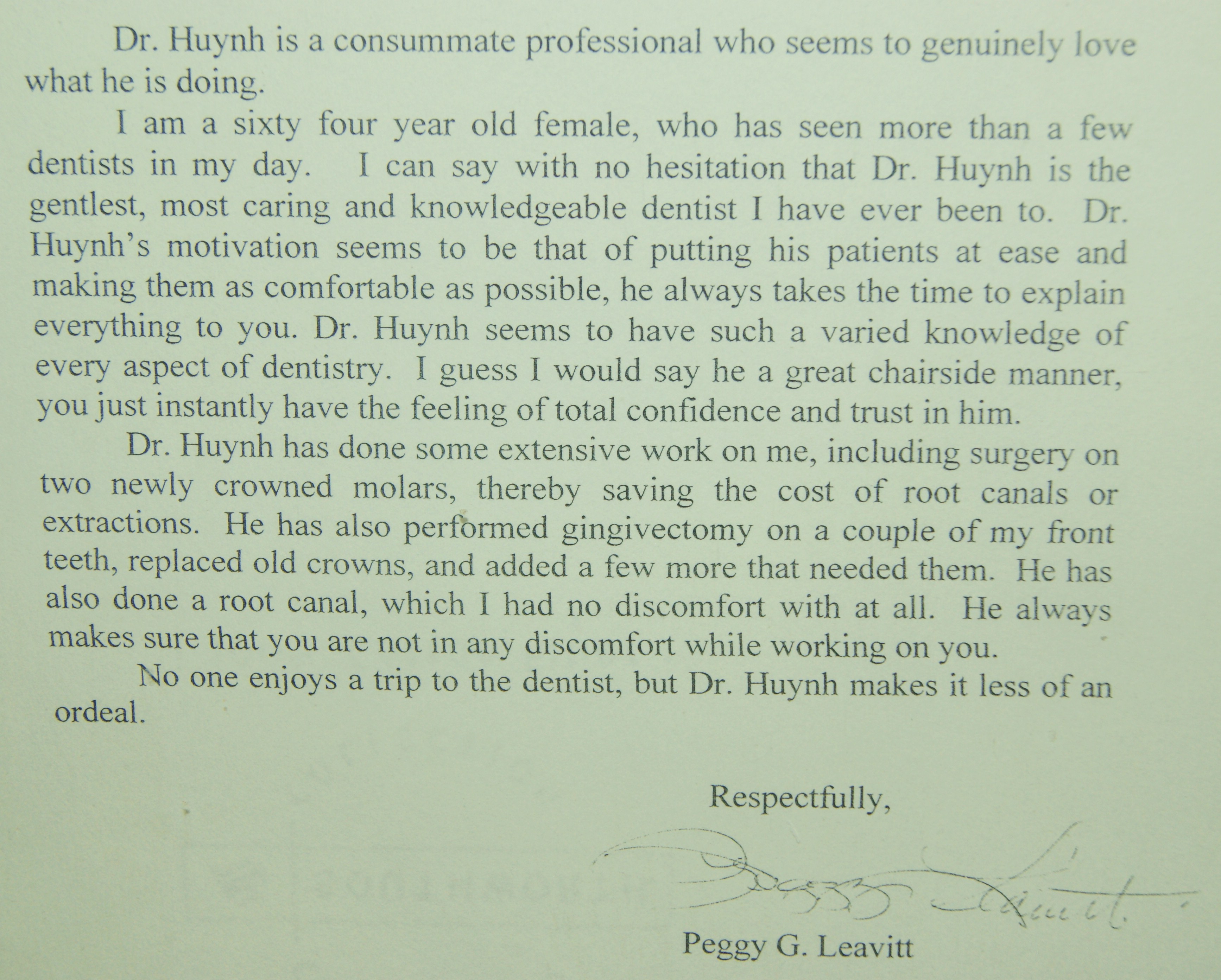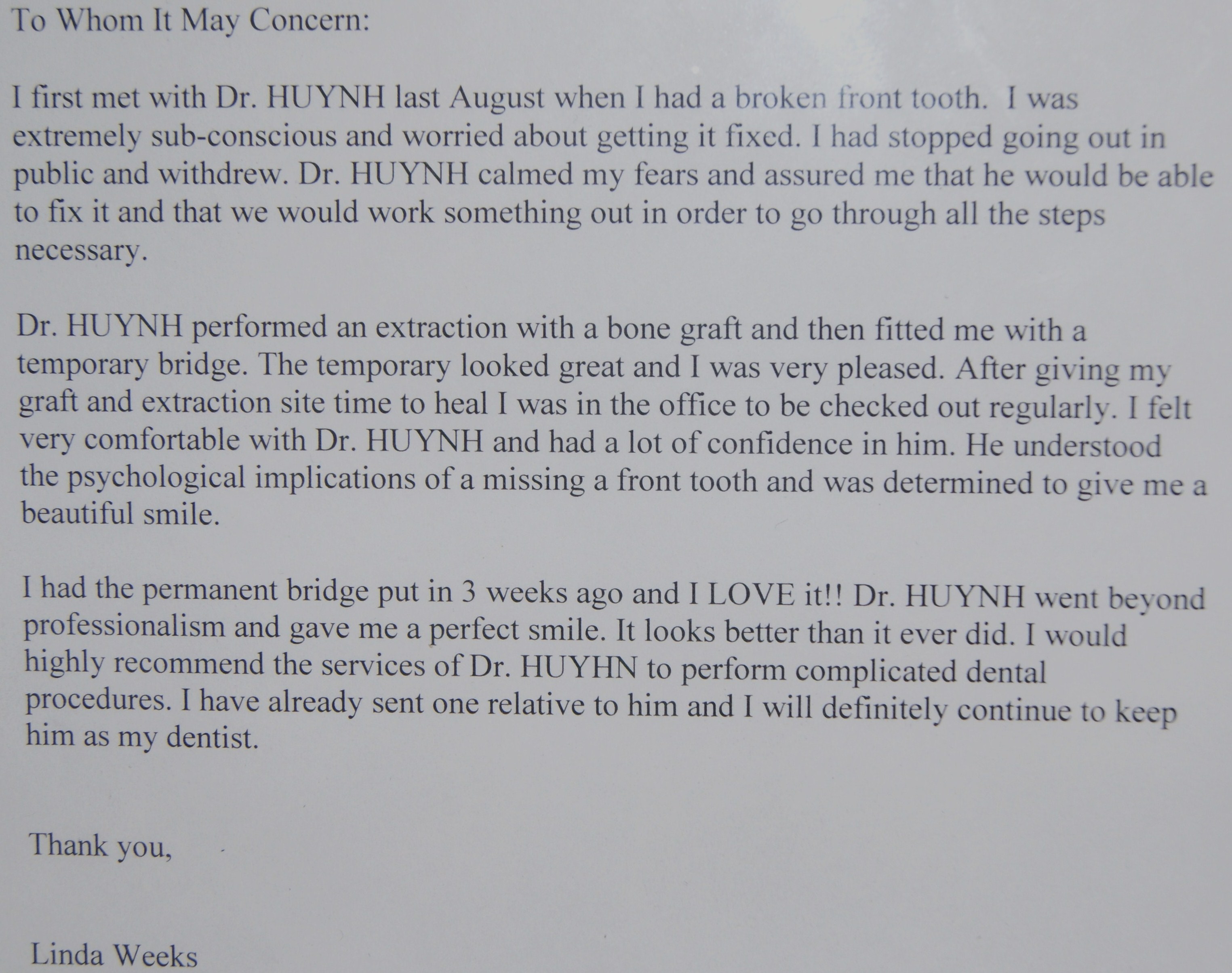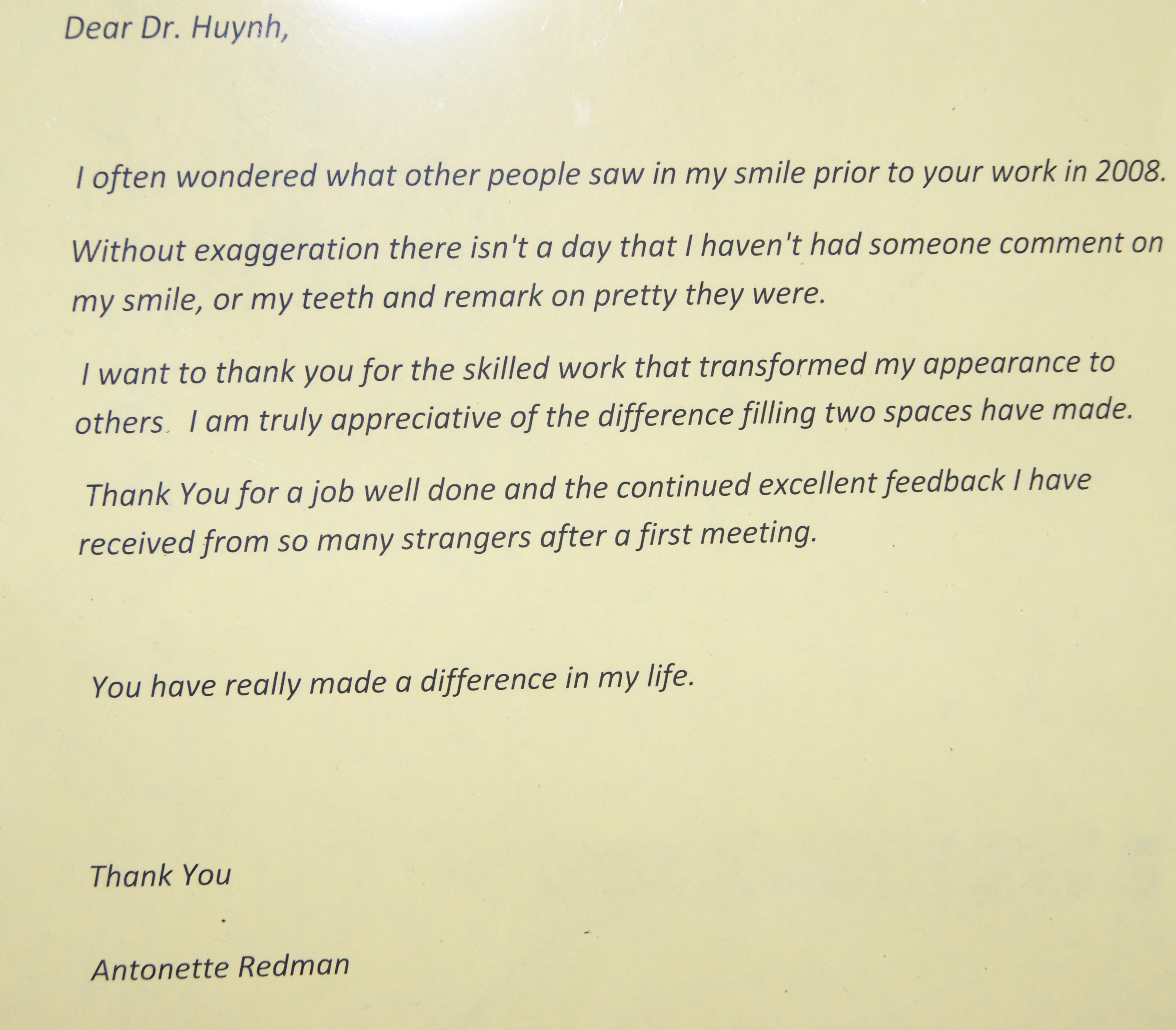 Having a beautiful smile has truly changed my life! Thank you, Dr. Huynh and staff for your kindness and dedication and to all your patients.